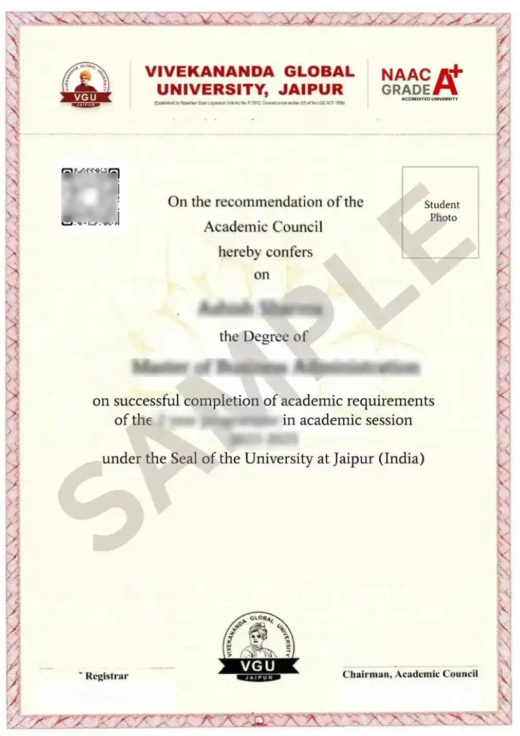 Degrees from Vivekananda Global University adhere to approved academic standards, making them valid for higher studies and professional use in India and various international contexts, subject to local regulations.